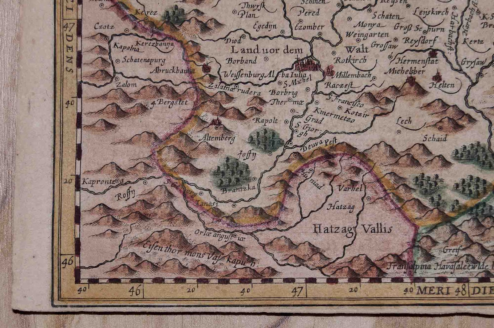 This map is taken from the 1630's french edition of Mercator-Hondius (Jodocus Hindius) book, printed in Amsterdam. It shows the region of Transylvania in Romania, as well as the adjacent areas of Hungary and Wallachia. The map dimensions are 25,0 x 17,9 cm